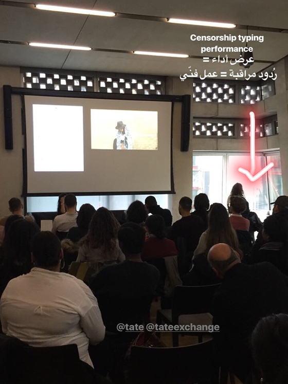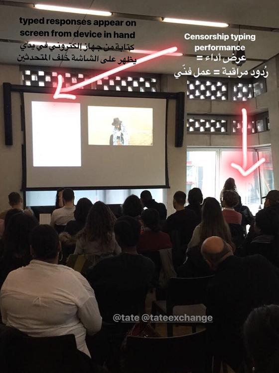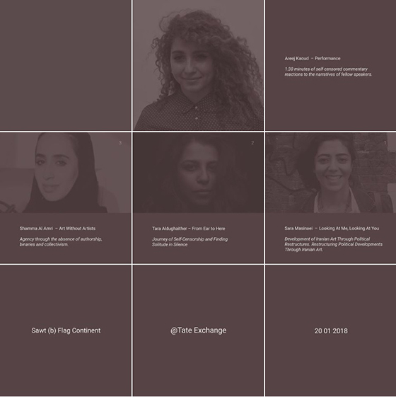 The first performance of I Censor took place at Tate Exchange in Tate Modern as part of the ‘Sawt II: Flag Continent’event on January 20th 2018. On this occasion this work was exhibited in response to speakers Sara Masinae, Shamma Al Amri and Tara Al Dughaitar addressing censorship in the Middle East.