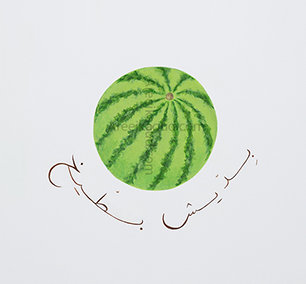 لوحة "بديش بطيخ" هي بطيخة غير مفتوحة تعزف على الترجمة العامية للبطيخ (كلام فاضي) أنني لا أريد أي شيء غير حقيقي بعد الآن