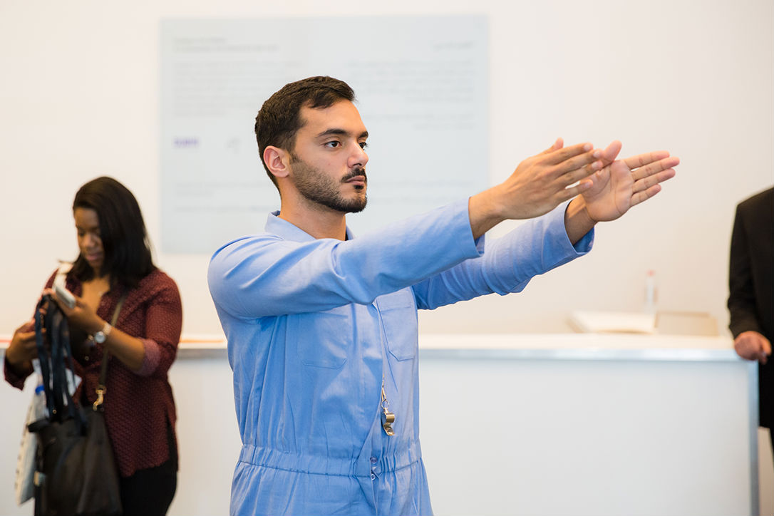 This work explores how the body, insignificant gestures and absurd repetitive movements can trigger narratives. Drawing on her interests in narratives and disastrous scenarios, Kaoud looked at potential emergency provisions designed for the site of the fair, Madinat Jumeirah, which could cause visitors to question their safety and secure spaces. By examining the safety manuals and precautionary materials that anticipate visitors’ behavior, Kaoud developed a work that challenges our notions of security in a public venue. This performance triggers narratives that speculate on one’s individual perceptions of a safe space and safety measures.